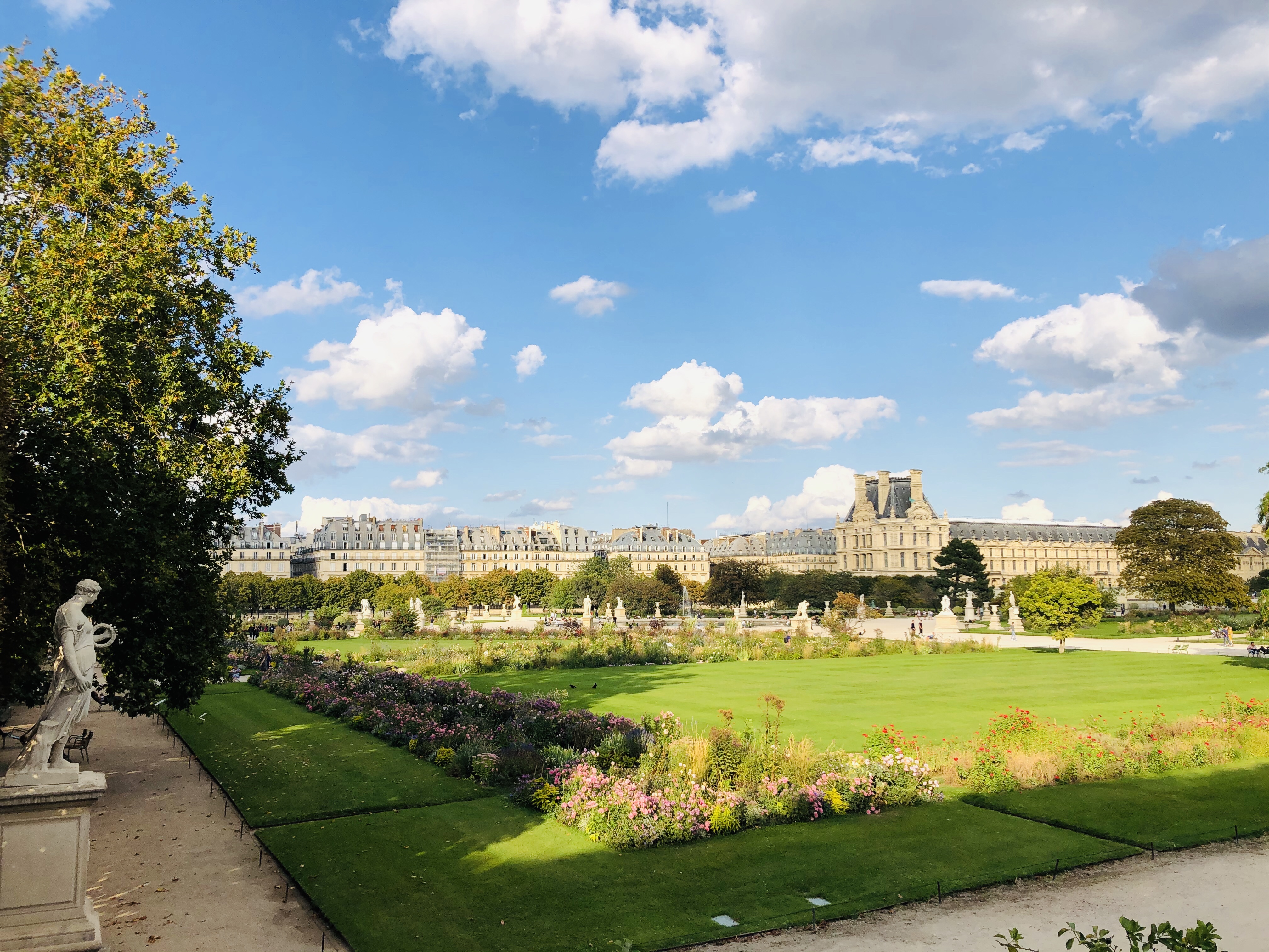 Walking on the Champs-Elysee I headed to the Louvre Museum. I passed through the Champs-Elysee Garden, through the Place de la Concorde, past the imposing statue of General Charles de Gaulle, until I reached the Jardin des Tuileries, the garden created by Catherine de Medici in 1564, owned by the Tuileries Palace, where most of the monarchs of France resided, even Napoleon Bonaparte; the palace was set on fire at the end of the French Revolution. All I can tell you is that it is a splendor, from the tall trees grown and cared for in a straight line, with all the flowers that color the vivid green with their efflorescence, with the statues that beautify even more the numerous artesian wells and statues, it is truly of poetic brilliance.